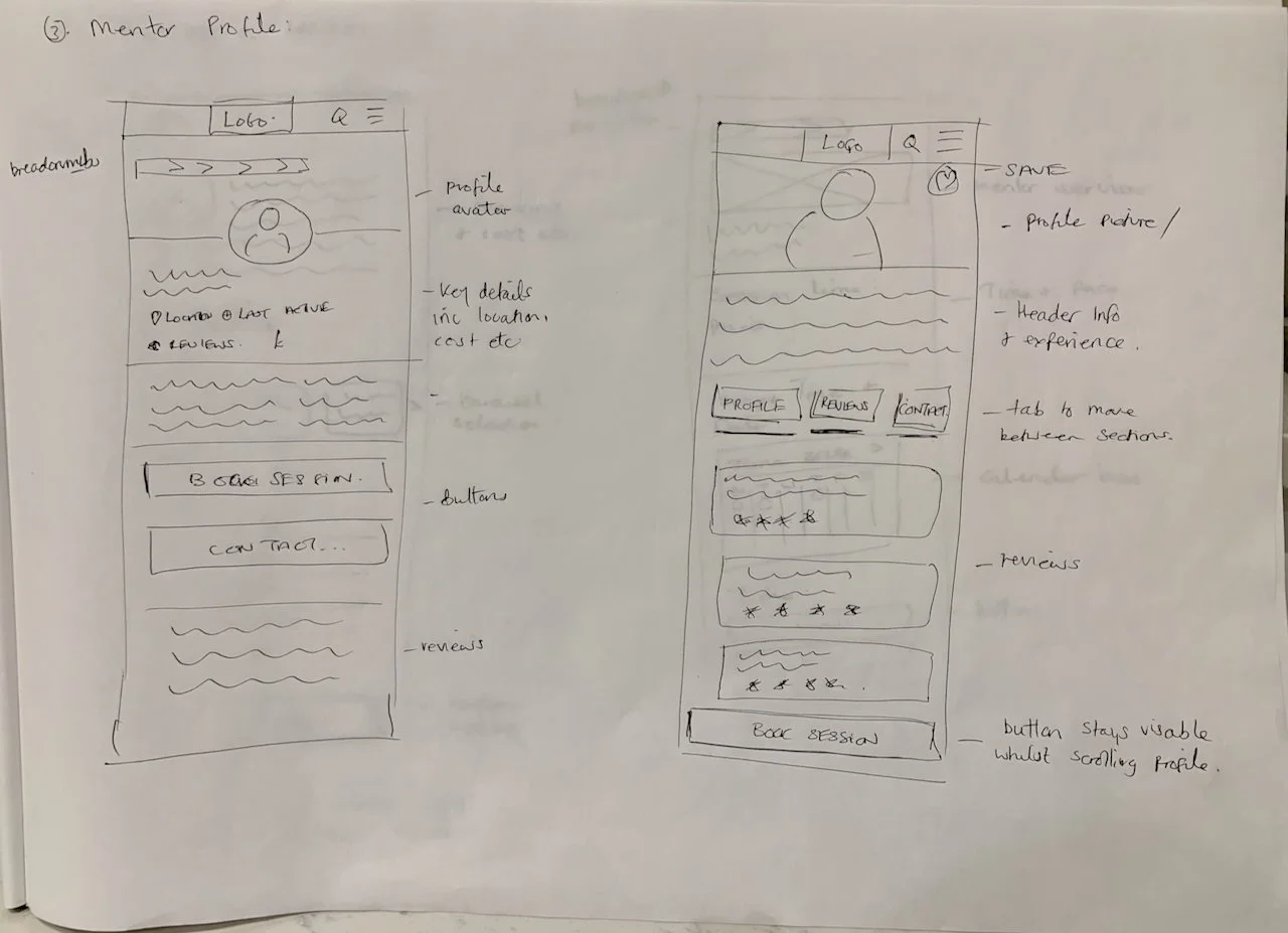 Low-fidelity sketches on paper allowed me to brainstorm ideas, start to visualise concepts and consider the layout and content of the product. My initial sketches were based on the information I had gathered from my user research, feature set, user and task flows. Initially putting pen to paper was challenging, but once I made a start, the exploration of ideas easily began to flow.