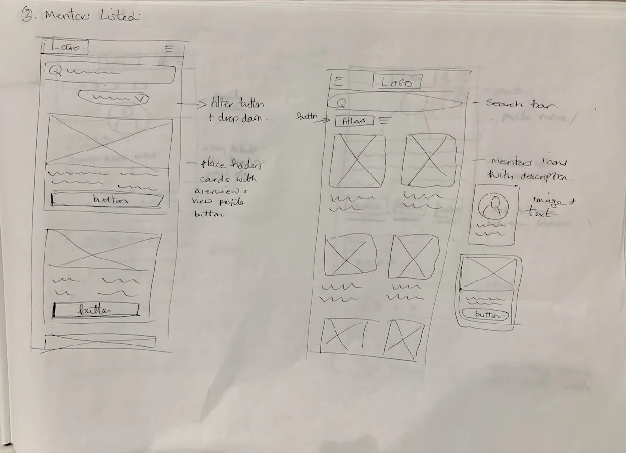 Using Figma, I translated my sketches into mid-fidelity wireframes for a responsive website. This also gave me the opportunity to learn and understand the mobile-first and content-first approach to creating products. By researching the content and design patterns that other websites had used, I has able to pinpoint the essential content I wanted to include for my product.
