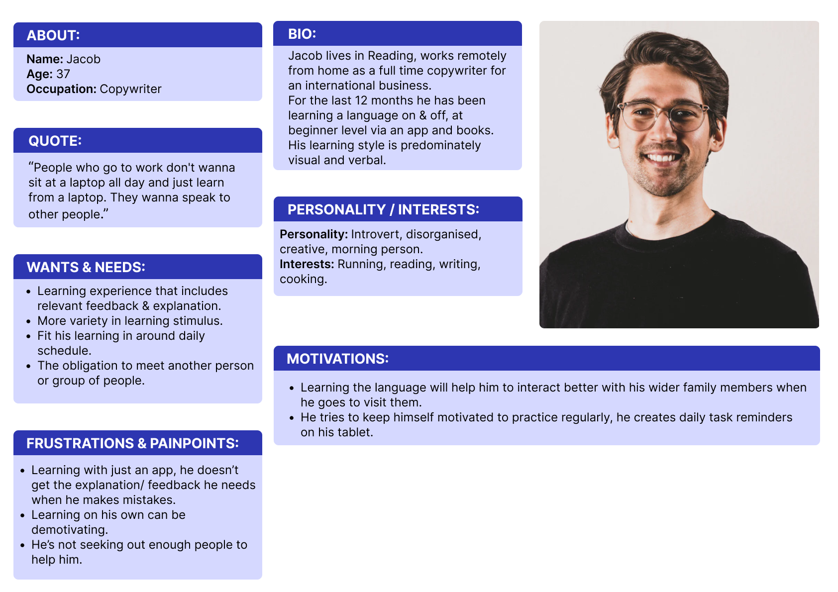 By creating a persona I was able to empathise with the end user and understand key needs, frustrations, motivations. I came back to the persona throughout the entire design process to make sure that I didn’t lose sight of the primary user goals.