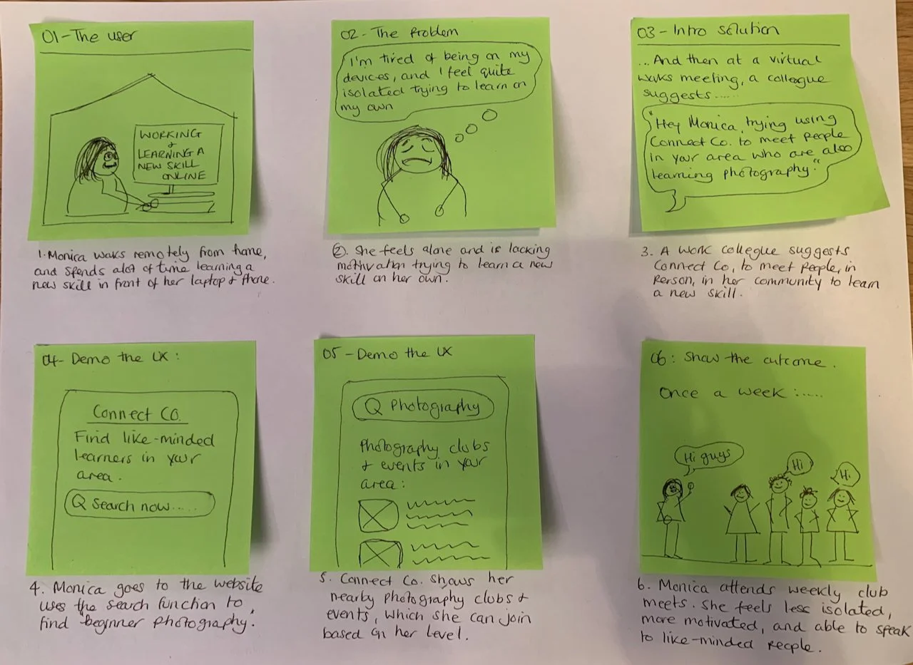 With the persona in mind, I drew two storyboards to paint the picture of the problem space and to begin visualising potential solutions. This part of the process gave me a high-level view of the problem space, introducing the solution, demonstrating the UX and showing the outcome.