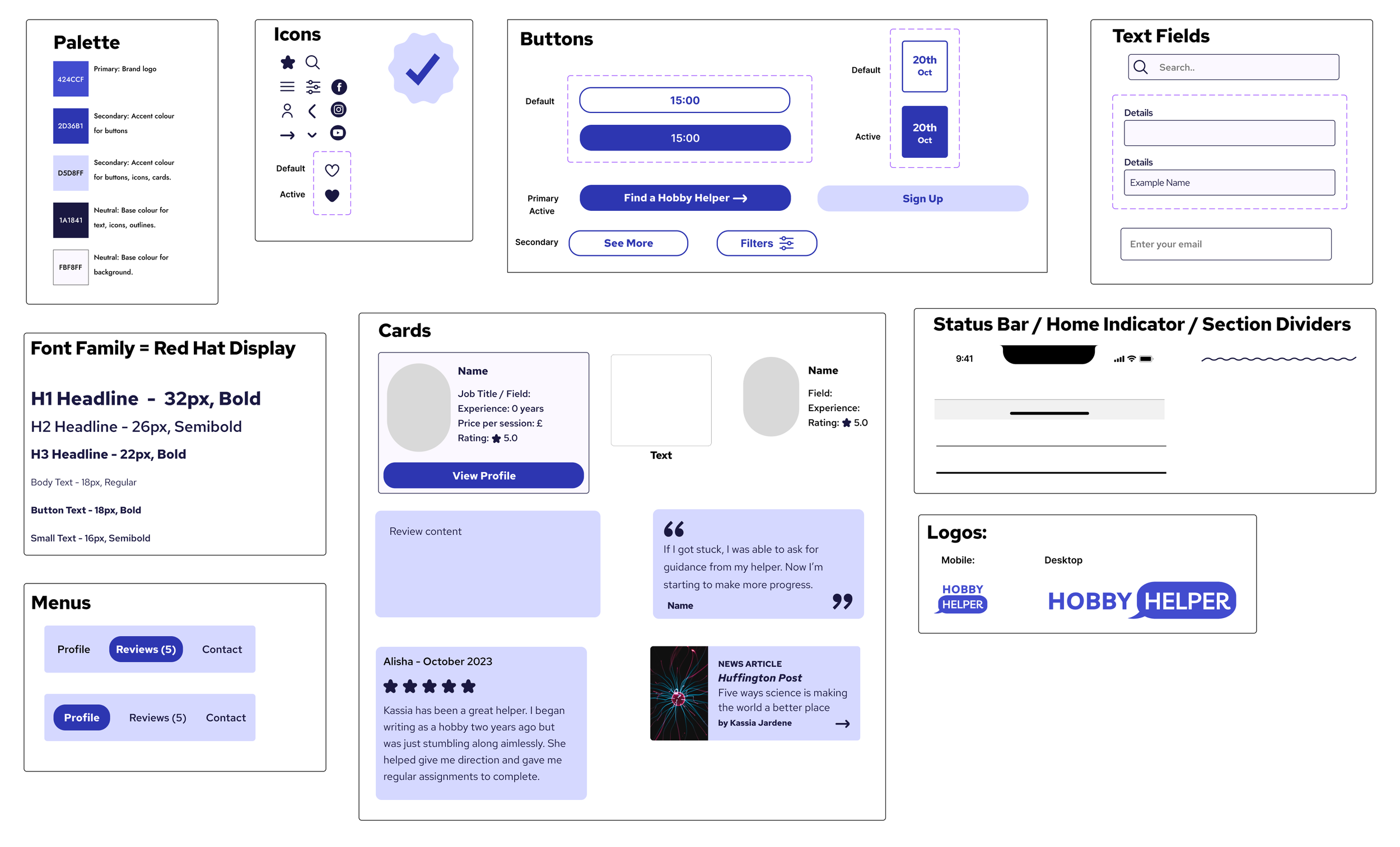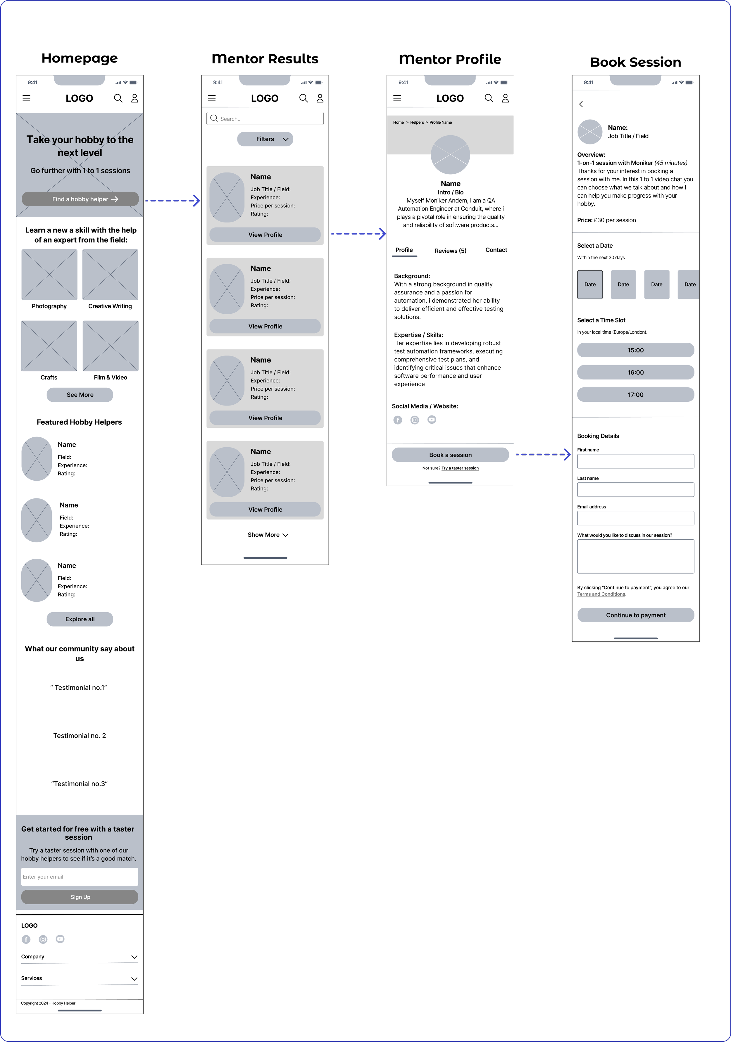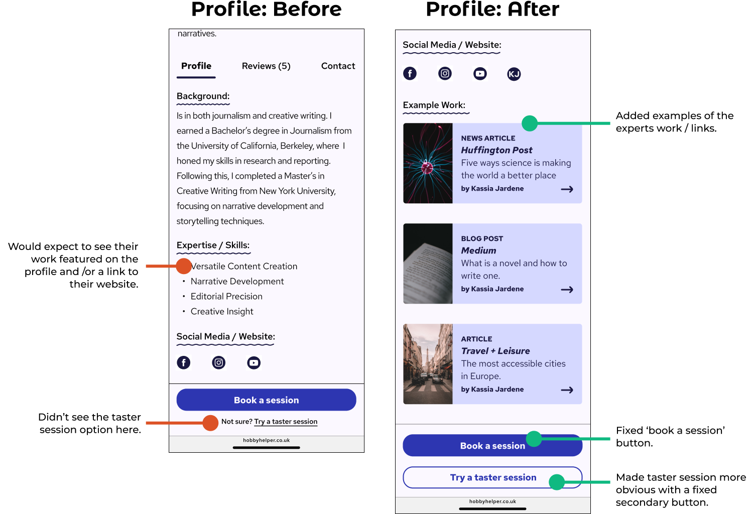 I created a functional high-fidelity prototype which I took to usability tests to validate the design and identify any areas for improvement. I conducted 8 usability tests remotely via Zoom, whilst sharing my Figma prototype. Each participant completed two specific tasks: 1) Finding a Hobby Helper profile and reading reviews 2) Booking a session with a photography helper with follow up questions around the overall look and feel of the product. The test results indicated that the website met with user expectations and was easy to use.